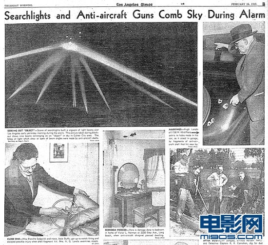 当时驻扎在洛杉矶的第37岸防炮旅的防空火力对准圣莫尼卡上空的“敌机”猛烈开火。刺眼的探照灯让洛杉矶的夜晚变成了白昼。洛杉矶有数千人在夜晚看到了布满空中的那些不明飞行物。有些“飞机”飞得很慢,据当时的士兵估计,飞行物的时速只达到200英里左右。但密集的炮火却没有击中任何飞行物,反而让城市遭到误击。天亮后,人们发现军队什么都没有击落。事后美国当时的海军部长Frank Knox通过媒体宣称该事件为防空警报系统的误报,但是有媒体发表的一些看法则认为,那天晚上出现的就是外星人的战机。 《黑鹰坠落》+《独立日》+《第九区》=伪纪录灾难片《洛杉矶之战》!?