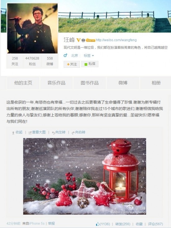 12月24日10点10分,汪峰微博发布一条圣诞感言:这是收获的一年,有悲伤也有幸福,一切过去之后更看清了生命懂得了珍惜。谢谢为新专辑付出所有的朋友,谢谢巡演团队的所有伙伴,谢谢陪伴我走过15个城市的歌迷们,谢谢相信我给我力量的亲人与挚友们,感谢上苍给我的眷顾,感谢你,那所有坚定真挚的爱,圣诞快乐!愿幸福与我们同在!