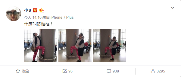 1905电影网讯 5月18日,小S在微博晒出三张“土味”机场街拍,并配文“什么叫没框框!”照片中小S身穿灰色卫衣黑马甲配粉色星型波点裤,脚踩黑色运动鞋,戴着墨镜手扶柱子凹出各种性感造型,堪称机场街拍女星中的“泥石流”。