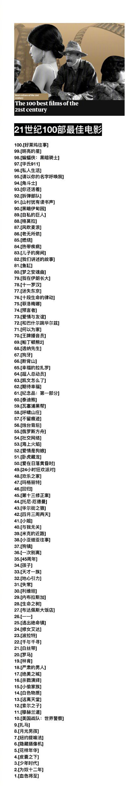 《卫报》评本世纪最佳100部电影 三部华语片上榜