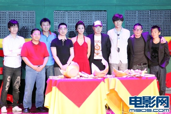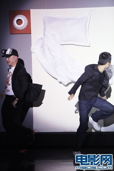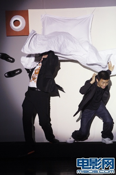 舞台上立着一个白色的背板,上面还固定着枕头、床单、台灯、拖鞋等物,乍看上去与真实的卧室毫无两样,这样的设计自然是想让两位主演原景重现一下,不过别看王宝强嘴里说着不尴尬,但是一提起现场演一段床戏,他和徐峥都扭捏了起来,在现场记者的连声要求下才走进了床单,靠在背板上,相互依偎着,还在导演叶伟民的指挥下演绎三段不同情境的床戏,在零下30度的情况下两人互相争抢床单,看到美女时两人的反应都有些“迟钝”,而叶伟民刚一说出最后一个情境“遇到地震了”,王宝强和徐峥就连忙从床单中钻出,总算解脱了。