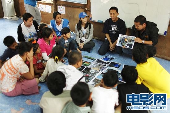 为了帮助生活在Mae La的难民更好地与泰国当地官员、工作人员及周边泰国本地居民沟通,这里特别开设了泰语课。在到达难民营与负责人见面并听取了简单的介绍后,姚晨一行人来到教室和大家一起上了一堂泰语课。一个脸上涂抹着防晒护肤草药的大眼睛男孩,开心地和姚晨交换起了知识,两人互相教对方中泰文关于“家”的表述。