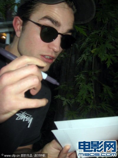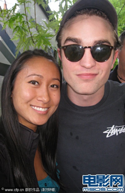 加拿大多伦多当地时间5月31日,因在2008年出演《暮色》系列中吸血鬼男孩而炮红的英国男星罗伯特·帕丁森(Robert Pattinson)在结束了新电影一天的拍摄之后,与女影迷亲密合影。女影迷低胸吊带依偎在帕丁森胸前,小鸟依人。帕丁森脸色粉中透白,露“吸血鬼”本色,黑色大墨镜笑容十分搞怪。帕丁森还心情大好的为影迷签名。