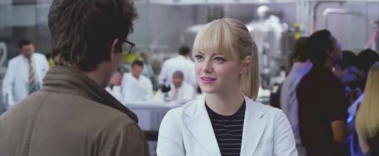 预告片开始,用闪回简单交代了彼得·帕克失去父母,和叔叔、婶婶相依为命的缘起;镜头马上重叠成已经长大的高中生彼得·帕克的生活,从同学们的眼神来看,彼得混的不太好,用导演的话是“戴着大眼镜的书呆子,不合群”。艾玛·斯通饰演的笑靥如花的格温·史黛西成了他生活的唯一亮点。