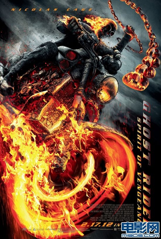 尼古拉斯·凯奇主演的《灵魂战车2:复仇之灵》也曝光了正式版海报,恶灵骑士在火焰中甩起铁链,预示着魔鬼骑士的回归,与之前的那张拽起铁链的手部特写海报相得益彰。
