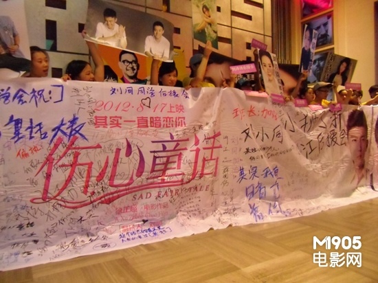 据悉,接下来《伤心童话》主创的粉丝还将在厦门、上海、重庆、沈阳五个城市继续接棒,在影片9月14日正式上映前,继续在自己所在城市的影院传递巨幅海报签名,为偶像票房助阵。