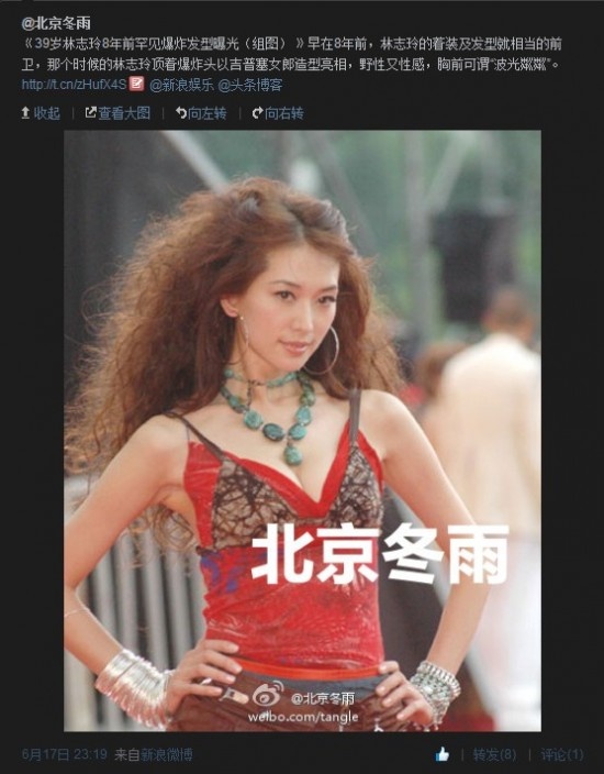 电影网讯 近日,随着《天机·富春山居图》上映,林志玲又成为大家关注的焦点和热议人物。昨天网友北京冬雨在微博上曝光了一组林志玲八年前的照片,照片上的林志玲顶着爆炸头,与她惯常的清纯甜美形象十分不同。