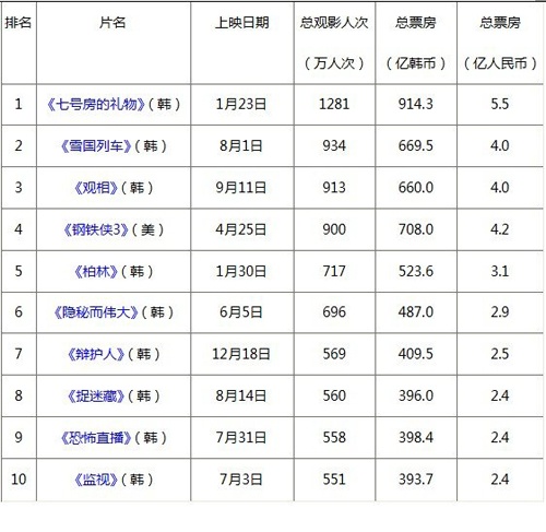 2013年韩国电影击败好莱坞 中韩电影市场正靠近
