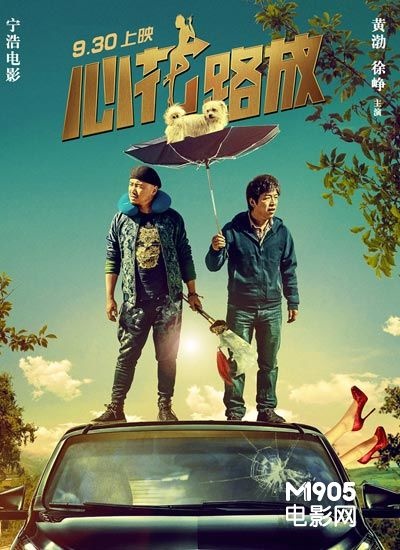 此外,《心花路放》的两款先导海报也于当天揭晓,其中一款徐峥与黄渤站在汽车上并肩远眺,表情暗藏怒火。青龙偃月刀、破雨伞等道具元素乱入,尽显宁浩的趣味。另一款海报中,黄渤、徐峥身披睡衣伫立在“夜巴黎”门前,两人怒目相向、拔枪对峙,场面滑稽。而在这场戏中,黄渤还要狂飙广东话,虽然与《疯狂的石头》中“顶你个肺”不同,但黄渤的表演足以令人喷饭。值得一提的是,在两款海报中均出现了小狗“果汁”,宁浩透露这只小狗在黄渤、徐峥这场惊险重重的玩命旅途中,占据着十分重要的地位。