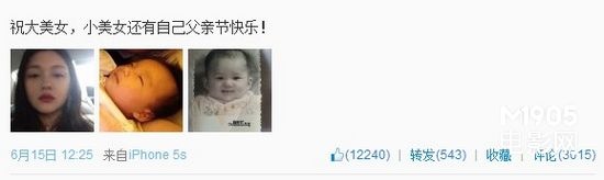 昨天是父亲节,大S老公汪小菲发微博称:“祝福大美女,小美女还有自己父亲节快乐!”同时还曝出一张自己刚出生时的照片,跟女儿几乎是一模一样。之后,大S也献上祝福:“他是全天下最幸福的父亲,因为她有一个这么贴心的女儿。”随后又娇羞地补了一句:“老婆其实也很贴心!”
