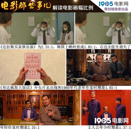 而通常一部电影从头到尾都会使用同一比例,但在韦斯·安德森导演的《布达佩斯大饭店》中,三个时代的故事用了三种不同比例的画幅呈现,受到了影迷们的热捧。片名和1980年代老年作家时期是1.85:1的标准宽银幕,1960年代年轻作家时期是2.35:1的变形宽银幕,1930年代主人公年少时期是1.37:1的方形银幕。一部电影中画幅比例的切换,也颇为体现导演的良苦用心,也是观众观影的一大乐趣。