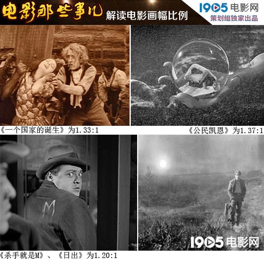 有趣的是,电影画幅比例基本上是以慢慢变宽的趋势在发生变化。无声电影时代画幅比例多是1.33:1,因为胶片本身的比例就是如此,如1915年《一个国家的诞生》。而到了1927年有声电影时代拉开帷幕之后,经过了5年的探索,期间还曾有最接近正方形的1.20:1比例影片登场,如弗里茨·朗执导的《杀手就是M》、F·W·茂瑙执导的《日出》和金·维多执导的《哈利路亚》等,直到1932年美国电影学院委员会才明确将1.37:1作为35mm有声电影的标准画幅比例,所以1.37又被称为“学院比例”(Academy ratio),成为不仅是好莱坞也是全世界电影通用的最常见的画幅比例,如1941年的《公民凯恩》。