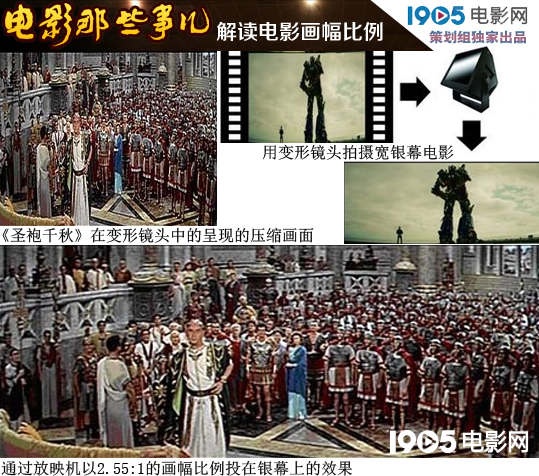 二十世纪福斯公司也开发出CinemaScope,即用变形镜头(Anamorphic lens)拍摄的宽银幕。1953年的《圣袍千秋》就是使用变形镜头拍摄,通过镜头对投影图像进行变形处理,用35mm的胶片拍摄出画幅比例为2.55:1的影片。