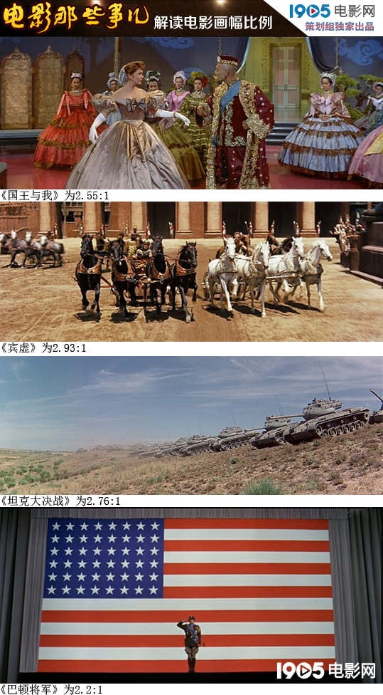 之后,无论是使用70mm胶片还是使用变形镜头拍摄让宽高比在2倍以上的电影越来越多,2.35:1逐渐成为变形宽银幕的标准比例。当然也有特例,比如1956年《国王与我》是用55mm胶片拍摄,画幅比例为2.55:1。1959年《宾虚》是2.93:1,1965年《坦克大决战》则是2.76:1。1970年《巴顿将军》用70mm胶片拍摄,画幅比例为2.2:1。