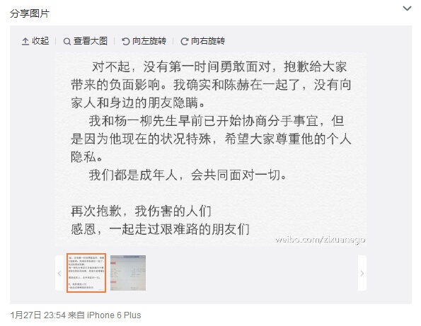 随后,张子萱也通过微博承认和陈赫在一起,发声明称:“对不起,没有第一时间勇敢的面对,抱歉给大家带来的负面影响。我确实和陈赫在一起了,没有向家人和身边的朋友隐瞒。”并称和杨一柳早已提出离婚,“我和杨一柳先生早前已开始协商分手事宜,但是因为他现在的状况特殊,希望大家尊重他的个人隐私。我们都是成年人,会共同面对一切。再次抱歉,我伤害的人们,感恩,一起走过艰难的朋友们。”