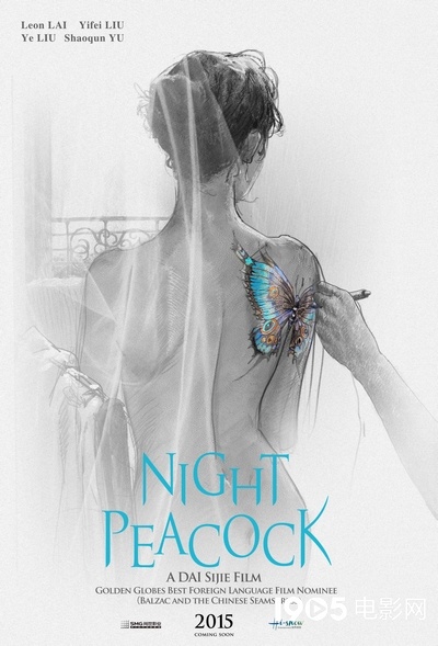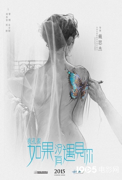 片方率先曝光了中英文两款“夜孔雀版”海报。此款海报以素描手法描绘了一位少女曼妙的身姿,盘起的卷发、曲线优美的背影在一层薄纱的隐匿下显得妖娆且神秘,而少女肩上那枚蝴蝶刺青在一片素色中异常耀眼。让人不禁好奇,这位少女是谁?是以清纯形象示人的女主角刘亦菲吗?令人瞩目的是海报上少女背后的纹身,那栩栩如生的蝴蝶,便是堪称电影灵魂的“夜孔雀”。