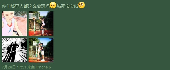 7月28日下午,张嘉倪在微博发文:”你们城里人都这么会玩吗,热死宝宝啦。“并且配上了一组自己配男友大篮球的照片,其中有一张张嘉倪站在篮球上才与男友一齐高,两人忘情接吻的图片,令不少网友看呆。