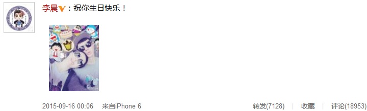 9月16日零点,李晨在微博发文:“祝你生日快乐!”晒出与女友范冰冰的甜蜜照来庆祝。照片中,范冰冰依偎在李晨肩上,吐舌搞怪,李晨把头靠在范冰冰头上,还撅着嘴唇,一副卖萌的样子。