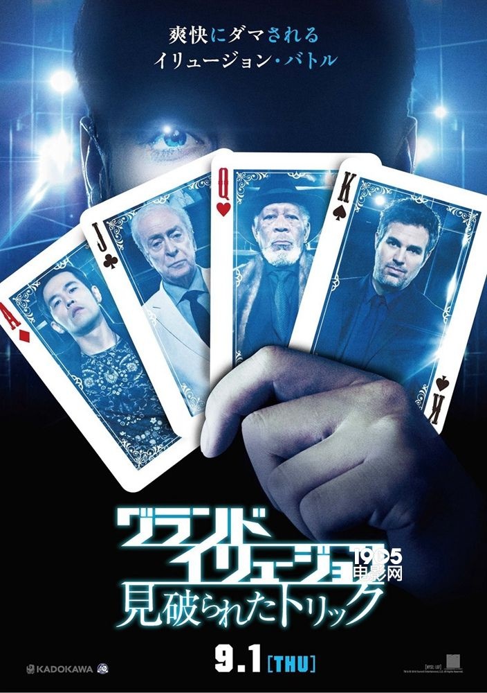 在各国海报中,分A、B两个版本的日本版海报显得创意十足。深蓝暗色系基调瞬间营造出一种神秘感,隐藏在幕后的神秘人物右手手握四张纸牌,每张纸牌分别是周杰伦、迈克尔·凯恩、摩根·弗里曼以及马克·鲁法洛。同时,神秘人右眼放光,似乎在笑又似乎在注视一切。而当神秘人露出左眼的时候,手上的纸牌又变成了四骑士,这些重量级角色竟全被掌握在一人手中,让人忍不住猜测,这个幕后神秘人到底是大反派丹尼尔·雷德克里夫还是四骑士背后的神秘天眼组织,这些疑雾重重的信息让人忍不住想去影片中一探究竟。