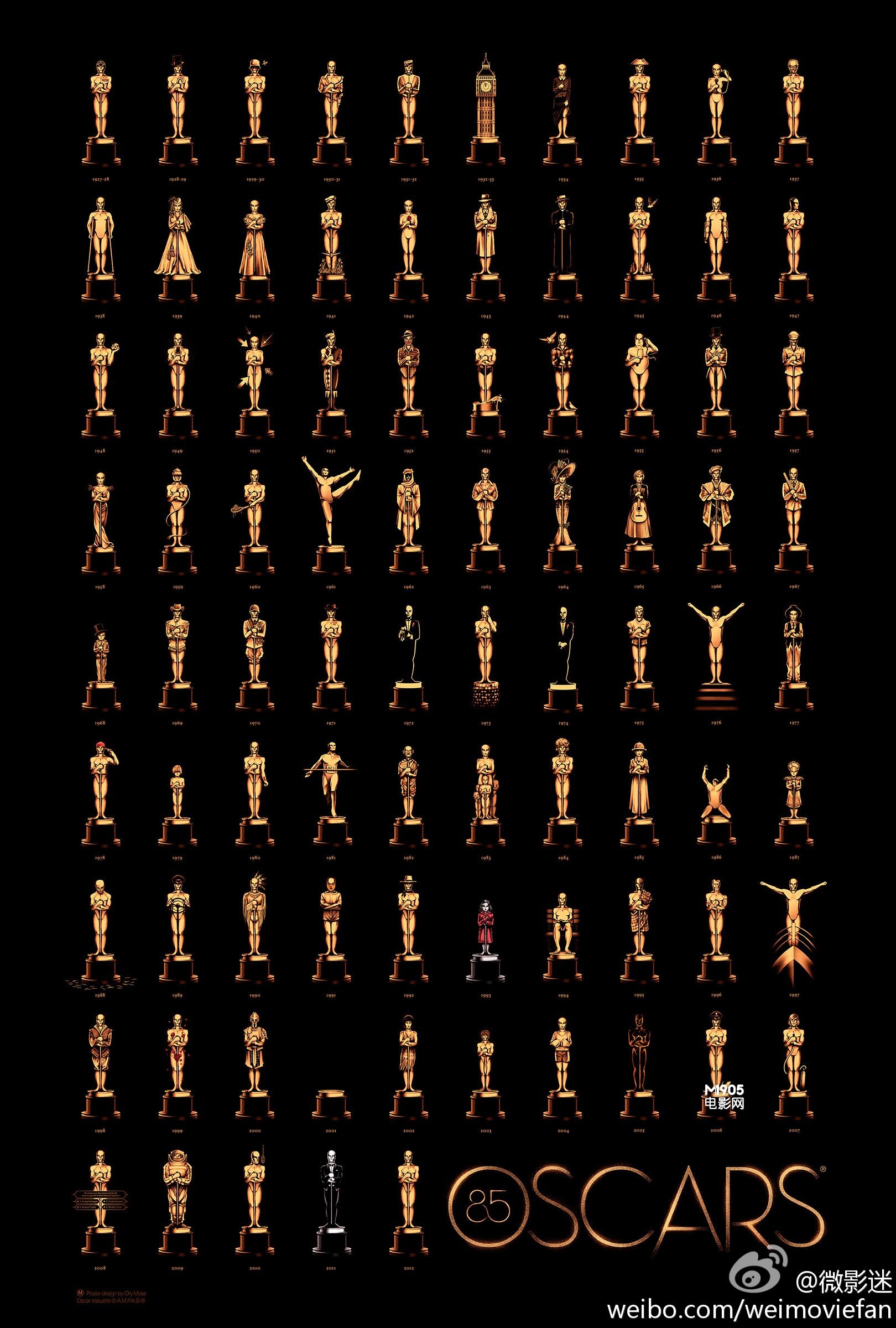 作为80多年来一直享有盛誉的电影奖项,奥斯卡不仅反映美国电影艺术的发展进程和成就,而且对世界许多国家的电影艺术有着不可忽视的影响,其每年的官方海报设计也颇受关注。奥斯卡海报也历经50多年的变迁,从最初的卡通招贴画味十足到光芒万丈的奢华璀璨、致敬经典,无论是简约概念、还是复杂繁琐,都少不了精致的艺术设计与背后所含有的独特意义。