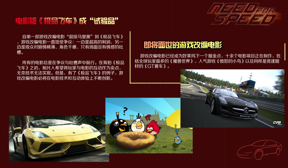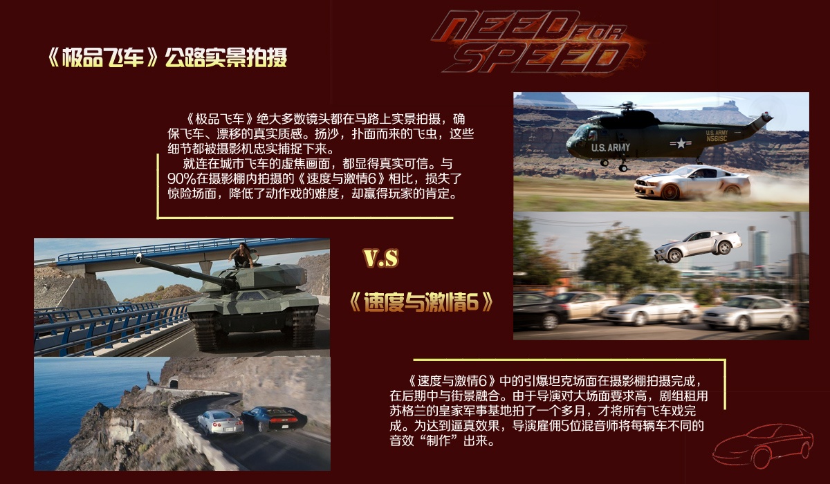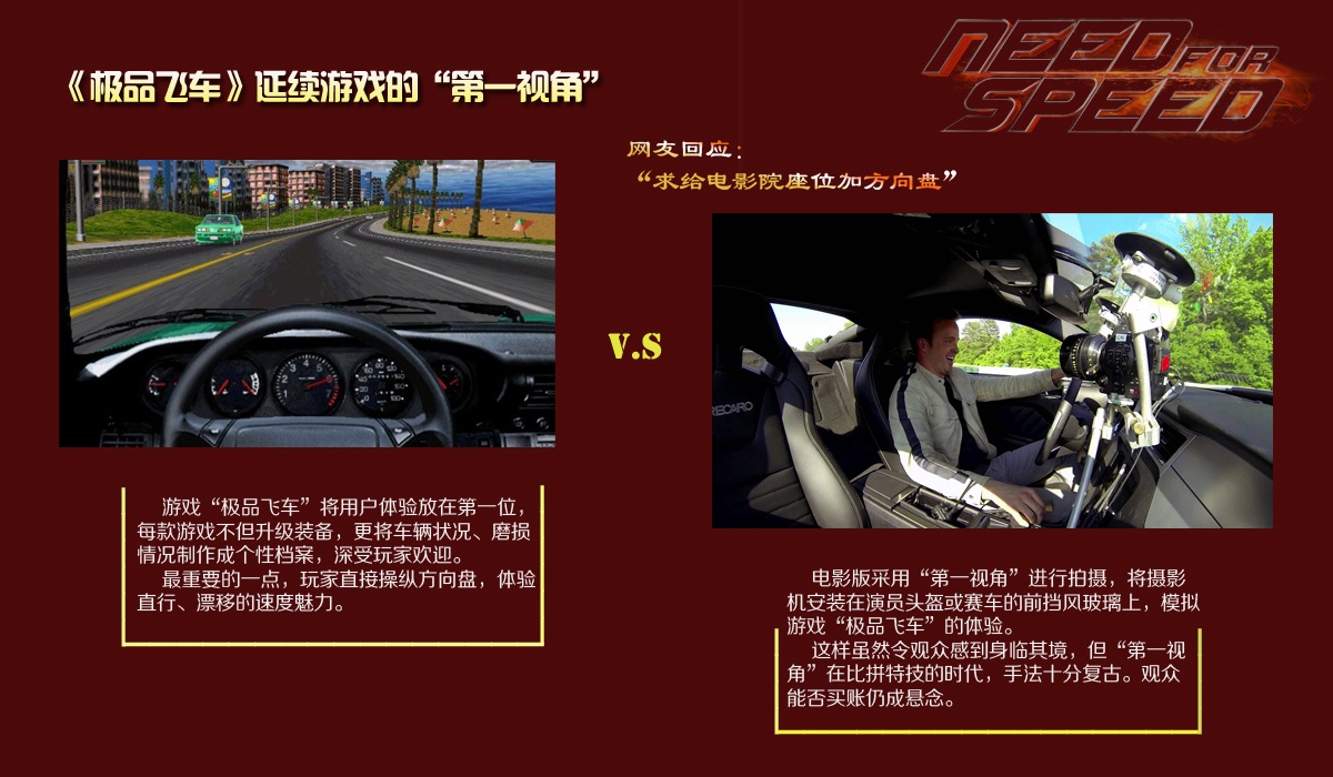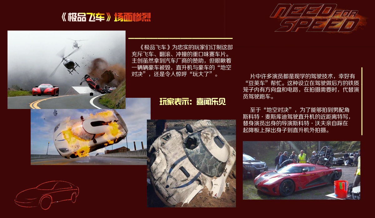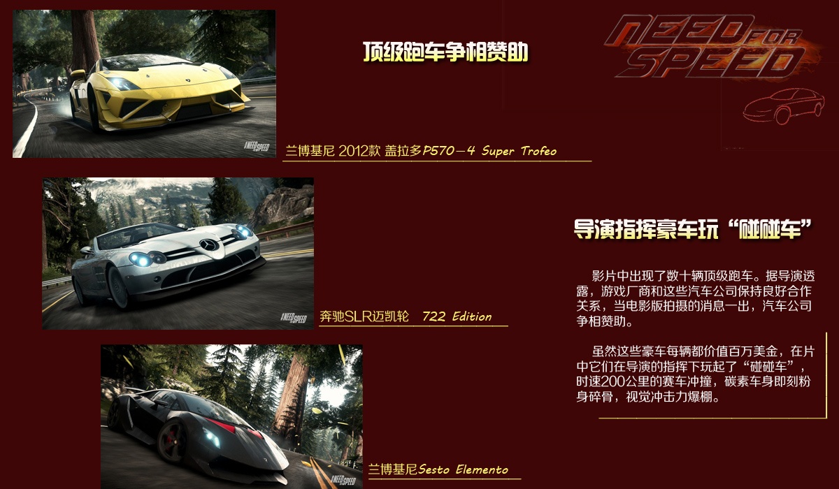 《极品飞车》已在中国内地院线上映。这部游戏改编电影,此前一直被片商寄予厚望,希望影片可以砍下高票房。片商从众多顶级汽车厂牌那里拿到赞助,数十辆顶级跑车在片中竞速、翻滚、爆炸,令人肾上腺素飙升。影片辗转美国多地高速公路取景拍摄,真实的路况和丰富的细节令玩家和观众大开眼界。