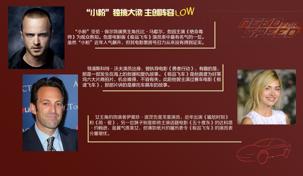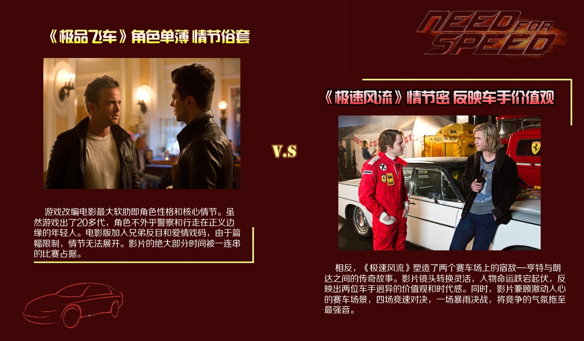 虽然影片飙车戏十分精彩,但在游戏改编电影的弱项上,并没有多大的提升。“小粉”亚伦·保尔独撑大局,演员之间互动不强,兄弟反目的桥段十分老套。可以说,《极品飞车》成为游戏改编电影的“试验品”,为其后即将上映的