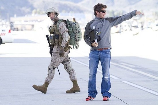 近日一组片场照也曝光于网络,照片中包括艾伦哈特在内的演员们在一个空旷的训练场,旁边则是军用飞机等真家伙,看起来似乎在接受训练,以求达到最真实的效果。为了呈现真实的战争场面,美军大力协助,派出驻守在加利福尼亚州的部队参与电影制作,还提供了包括V22鱼鹰式旋翼机、CH46海骑士运输直升机等各种装备,军事迷当可大饱眼福。