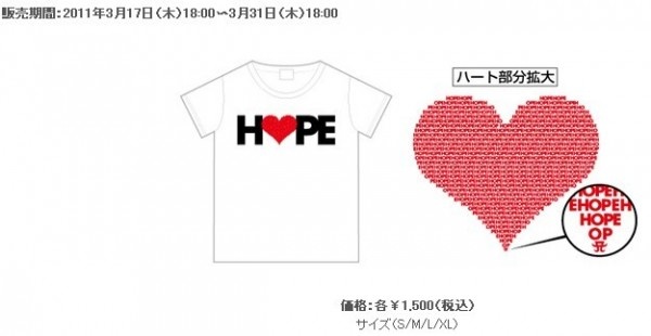 此款T恤是滨崎步与时尚杂志昕薇(ViVi)联手打造,希望通过这种义卖方式将爱心传递给灾区的受难同胞。据了解,该T恤售价为1500日元(约合人民币119元),尺码共分为S/M/L/XL四个型号。T恤以白底为主,胸前LOGO是用黑色字体设计的“HOPE”字样,中间的O设计成了一颗红心。T恤的设计者滨崎步表示“这次大地震令很多人无家可归,我感到非常难过。感谢大家的爱心捐助,让我们携起手来为灾区同胞们祈福平安,共同祝愿他们早日重建家园。”