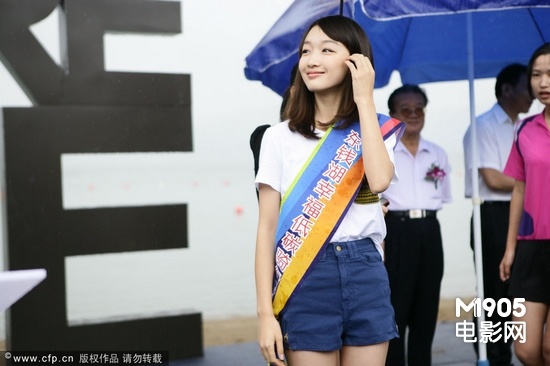 周冬雨一出现在主席台下,在等待上主席台的间隙,不少市民纷纷把视线投向了她。周冬雨穿着一件蓝色短裤,上着一件白色T恤,因为天凉的缘故,等待上主席台的时间里又披了件蓝色毛衣。由于下着雨,周冬雨自己打了把伞,静静的在下面等着。