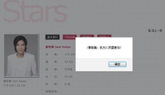 7日下午15点左右,微博上有爆料称萧敬腾的经纪公司喜鹊官网被黑。在萧敬腾经纪人公司的网页上,只有“雨神”萧敬腾的主页被黑,只要点击进入就会弹出“萧敬腾,杭州人民需要你”的窗口,不点“确定”网页无法浏览。15:45分左右萧敬腾个人页面出现了“Forbidden。You don't have permission to access /star_basic.php on this server。”的字样,网页已经无法显示,疑为工作人员内部维修中。而截至记者16点发稿时,网页已经恢复正常。