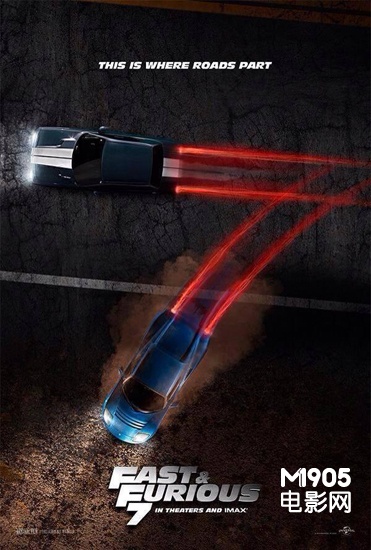 海报中两辆车驶往不同方向,后面的光延长交汇成大大的“7”形状。海报上有一行字“This is where roads part.(这是道路分岔的地方)似乎暗示着范·迪塞尔和保罗·沃克从此天人两隔,《速度与激情7》之后将会走向新的道路。