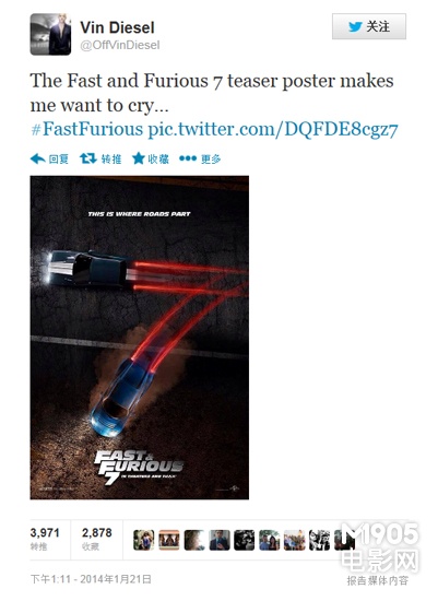 电影网讯 近日外网上流传着一张粉丝自制的《速度与激情7》海报,被盛赞为《速度与激情》系列有史以来最好的海报。《速度与激情》系列主演之一范·迪塞尔在个人推特上发布了这款海报,并写道:“这张海报让我想哭”,引发不少影迷转载留言,但随后有消息称这一推特账号是范·迪塞尔粉丝创建的,并非范·迪塞尔本人。