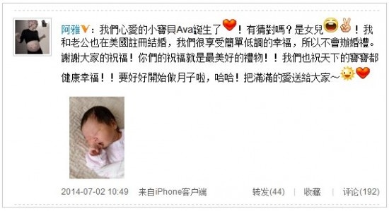 阿雅在微博中写到:“我们心爱的小宝贝Ava诞生了!有猜对吗?是女儿!我和老公也在美国注册结婚,我们很享受简单低调的幸福,所以不会办婚礼。谢谢大家的祝福!你们的祝福就是最美好的礼物!我们也祝天下的宝宝都健康幸福!要好好开始坐月子啦,哈哈!把满满的爱送给大家。”