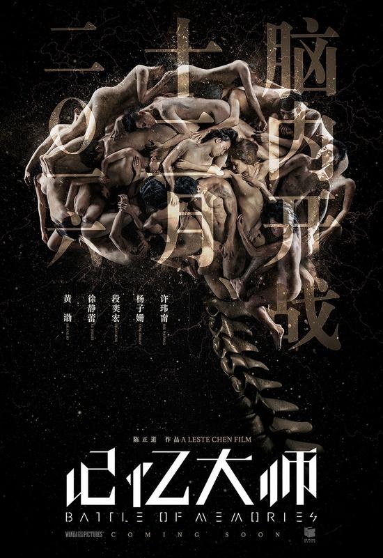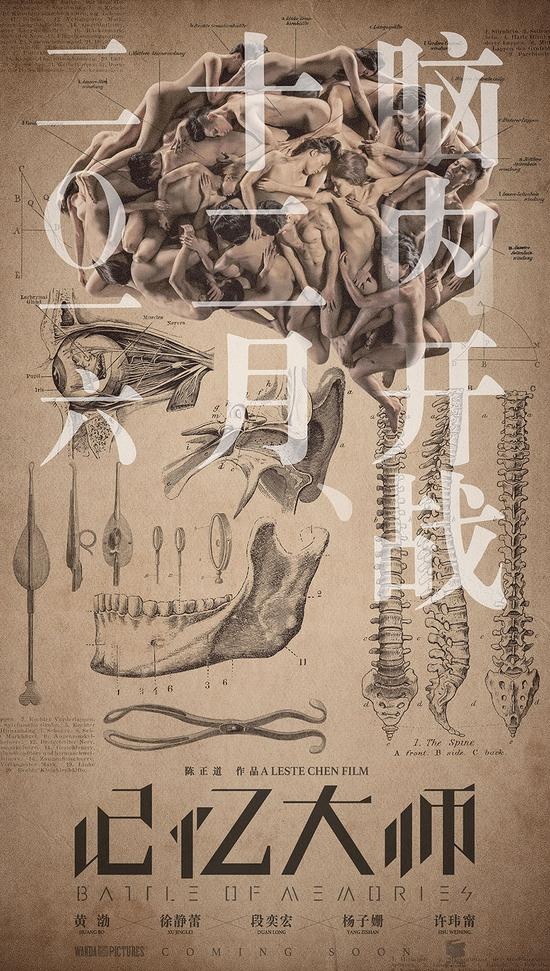 恰逢杀青之际,片方也随之曝光了影片首组先导海报。海报以“人形大脑”为主题,将人体头颅以X光透视的形式生动大胆地展现出来,极具悬疑感与科技感。十余具赤裸人体组成的大脑极具视觉冲击力,而作为神经中枢的脊椎骨、眼球、耳朵、下颌骨等主体,也分别对应了记忆介质中视觉、听觉、味觉等多维度感受,共同构铸成人脑完整独特的记忆系统,同时也预示着《记忆大师》将在大银幕上营造一场华丽的视听盛宴,将带给观众们独一无二的记忆体验。而海报中神秘悬疑的整体氛围,也恰好契合影片悬疑犯罪的类型特质。