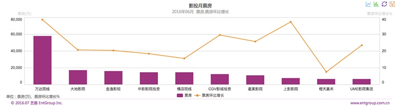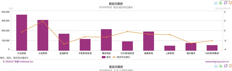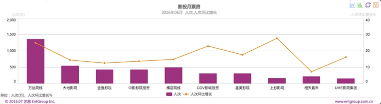 根据艺恩EBOT日票房智库数据显示,2015年的中国电影市场无愧是爆发式增长,全国影院总票房440.69亿元,同比增长48.7%;全国新增影院1420家,新增银幕8183块,平均每日新增22.4块,全国累计银幕32487块,银幕增长率33.7%,较上年提高1.6个百分点;其中,影投公司中表现最抢眼的万达院线、大地影院、金逸影视,在票房、场次、观影人次方面皆高居前三位。