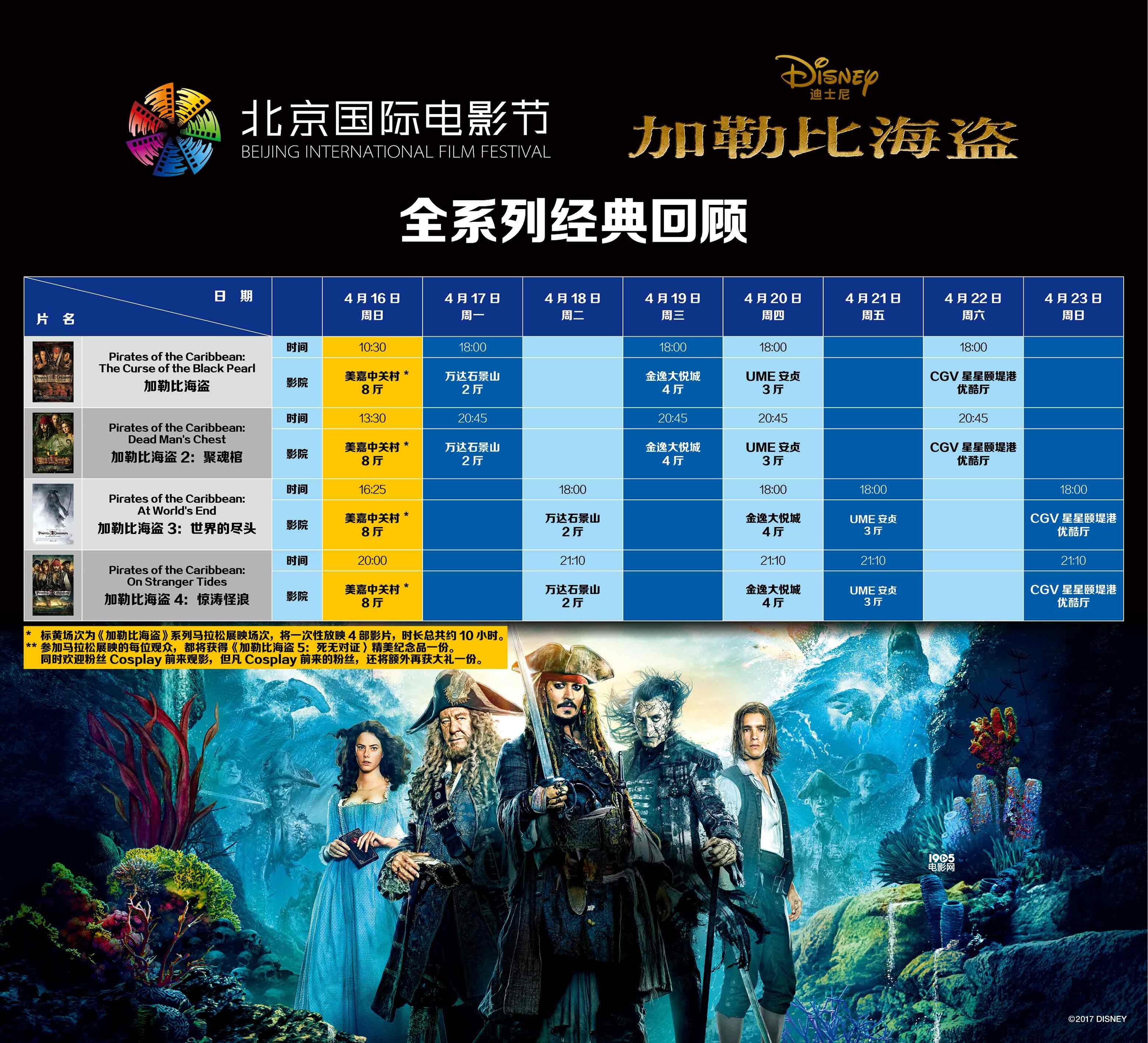 最值得一提的是,为了回应众多“海盗粉”对系列的狂热之情,迪士尼影业特别联合北京国际电影节推出了一场独一无二的《加勒比海盗》四部曲马拉松连映,将于4月16日早上10点30分,在美嘉欢乐影城中关村店8号厅震撼上演(售票同样将于3月31日中午12点在娱票儿/格瓦拉平台启动)。这场马拉松连映总时约10小时,将一口气连续播映《加勒比海盗》系列前四部影片,集中展示最为观众津津乐道的幽默、惊悚、诙谐、史诗等《加勒比海盗》系列深受全球观众追捧的经典元素,呈现出2017年最精彩绝伦的观影体验。而且参与这次马拉松连映的每一位观众,都将在入场时获得《加勒比海盗5:死无对证》精美纪念品一份。主办方同时号召死忠“海盗粉”Cosplay前来观影,与同好们共襄盛举;但凡Cosplay前来的粉丝,还将额外再获大礼一份。欢乐热闹、礼品多多,这场《加勒比海盗》四部曲马拉松连映绝对将成为“海盗粉”的盛大狂欢,值得每一位粉丝参与。