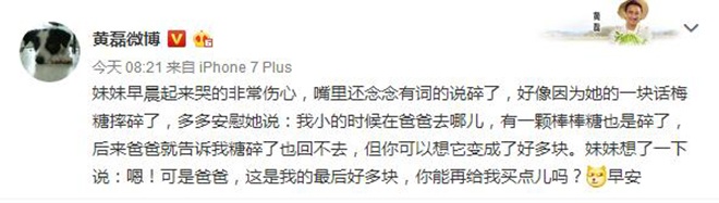 1905电影网讯 今早,黄磊在微博分享生活趣事,他写道:“妹妹早晨起来哭的非常伤心,嘴里还念念有词的说碎了,好像因为她的一块话梅糖摔碎了,多多安慰她说:我小的时候在爸爸去哪儿,有一颗棒棒糖也是碎了,后来爸爸就告诉我糖碎了也回不去,但你可以想它变成了好多块。妹妹想了一下说:嗯!可是爸爸,这是我的最后好多块,你能再给我买点儿吗?早安 ”高智商的他竟也被小女儿套路,十分逗趣。