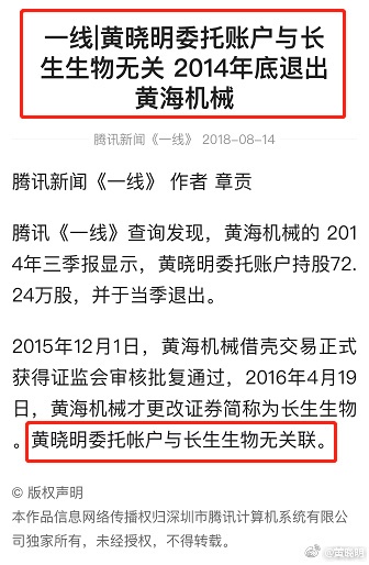 在微博中,黄晓明表示:7月3日证监会就“高勇案”已作出《处罚决定书》,而他本人没有参与任何股票操控证监会已于2018年7月3日就“高勇案”作出《行政处罚决定书》。同时黄晓明还否认自己认识本案核心人物高勇,也从未参与过“长生生物”股票投资。
