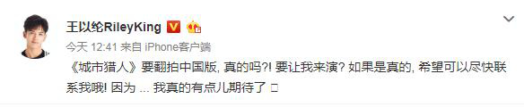 今日,网传男主王以纶则公开发文辟谣,称:“《城市猎人》要翻拍中国版, 真的吗?! 要让我来演? 如果是真的, 希望可以尽快联系我哦! 因为... 我真的有点儿期待了”否认出演《城市猎人》中国版的消息。