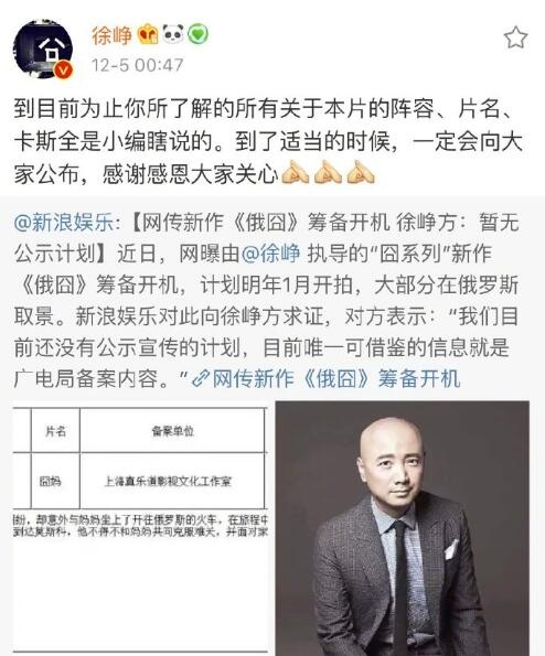 该消息随即遭徐峥本人否认,他表示,“目前为止你所了解的所有关于本片的阵容、片名、卡斯全是瞎说的。”不过,他也没有否认要到俄罗斯拍摄的消息。