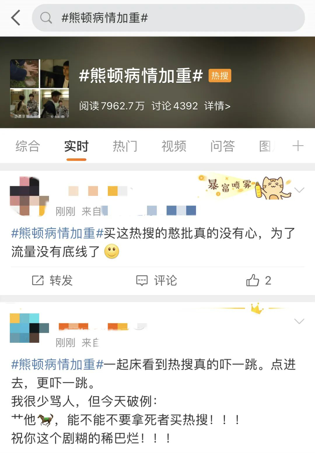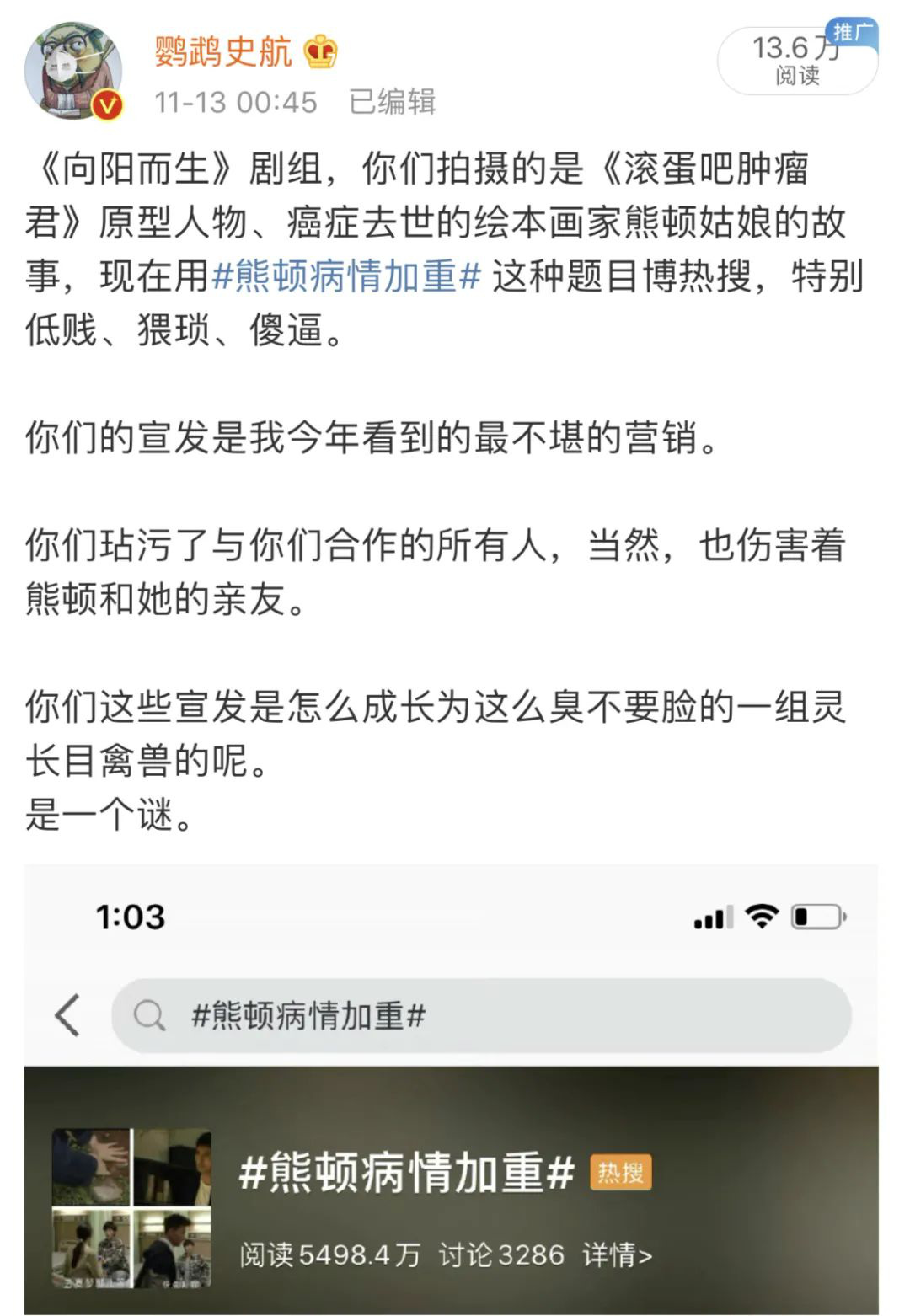 >大苹果:有看到。在我个人看来,这个宣传话题是拟定失当的,出现这样的话题,是宣传们对这个话题推广后会引发的结果预判不足。因为该剧本身用了现实中已故人物的真实姓名作为角色名,那么在平时剧宣中很常规的#角色名+重点剧情#这样格式的话题推广,在该剧中就要慎之又慎了,#熊顿病情加重#这个话题肯定是不合适的。