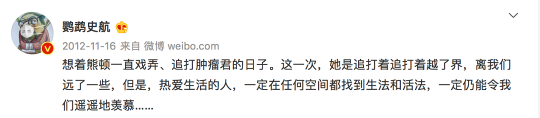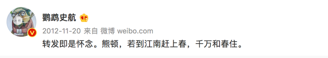>芝士桃桃:之前没太关注到,后来才去了解了相关来龙去脉。发表看法之前,我特意在史航老师的微博里搜索了一下关键词“熊顿”,在这次“批斗宣发”之前,他最后一次提及的微博是2012年。