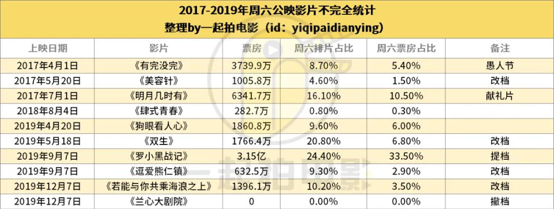 刨除那些基本裸发且最终票房几乎可以忽略不计的小片。2017年和2018年选择在周六公映的影片还没有形成集群。而到了2019年则有6部影片选择于周六公映,除了《狗眼看人心》,其余五部电影都曾撤档或者改档,《兰心大剧院》至今还未重新定档。