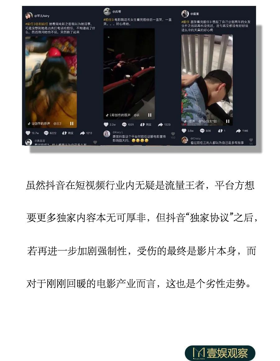 虽然抖音在短视频平台上无疑是流量王者,平台方需要更多独家内容本无可厚非,但抖音“独家协议”之后,若再进一步加剧强制性,受伤的无疑是影片本身。