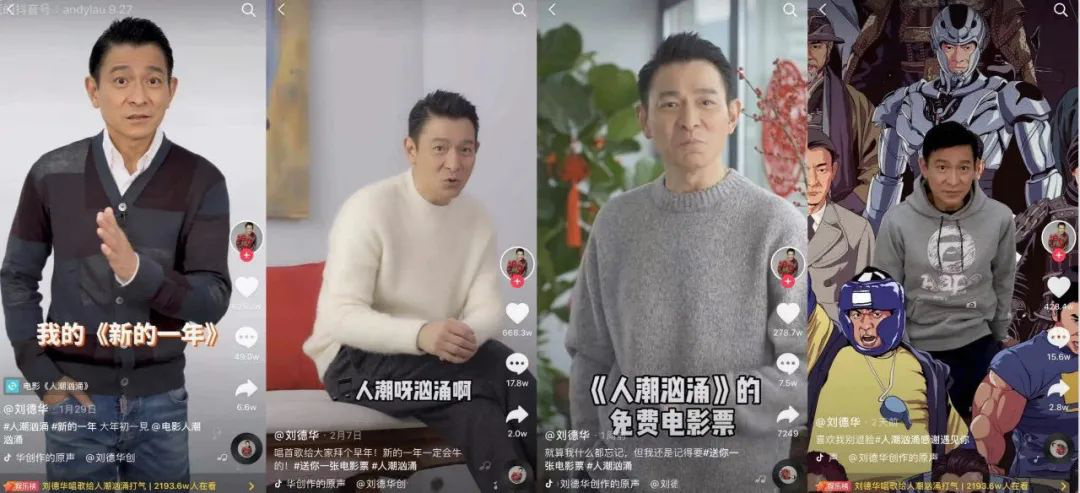值得一提是,《人潮汹涌》映前将热度“赌注”完全倾向于抖音,由于主创刘德华入驻抖音,即使影片预售成绩一直萎靡不振,但抖音仍给予《人潮汹涌》除《唐探3》《李焕英》外最大的流量支持。刘德华抖音账号粉丝短时间突破5500万(截至目前到5700万),春节档期间,根据电影双周报告显示,电影《人潮汹涌》抖音官方账号点赞量位列第三、粉丝创作视频播放量升至第一等等。