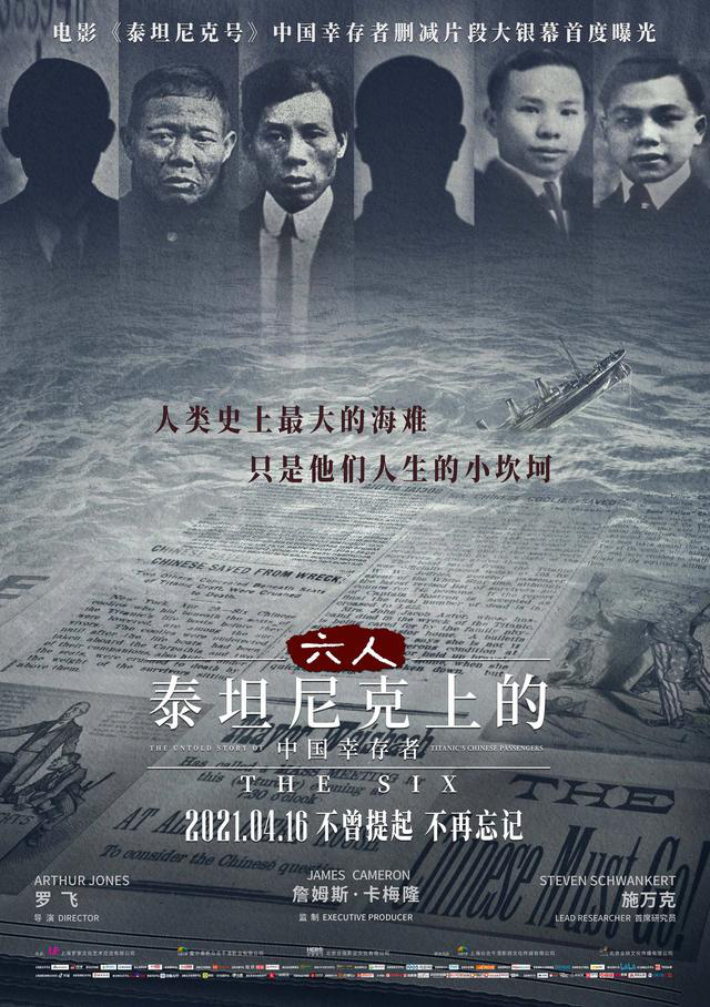 时光网讯由罗飞执导、好莱坞殿堂级导演詹姆斯·卡梅隆担任监制、首席研究员施万克讲述的纪录片《六人-泰坦尼克上的中国幸存者》(以下简称《六人》),将于4月16日在中国大陆上映。