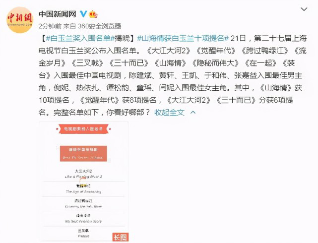 众所周知,国产电视剧有三个重量级的奖项,历来得到了观众们和电视剧创作者们的高度认可,这三个奖项分别是飞天奖、金鹰奖和白玉兰奖。其中最受年轻人欢迎的是金鹰奖、受专家们亲睐的是飞天奖,而白玉兰奖则是观众、专家、演员都认可的电视奖项,所以,综合含金量非常好。