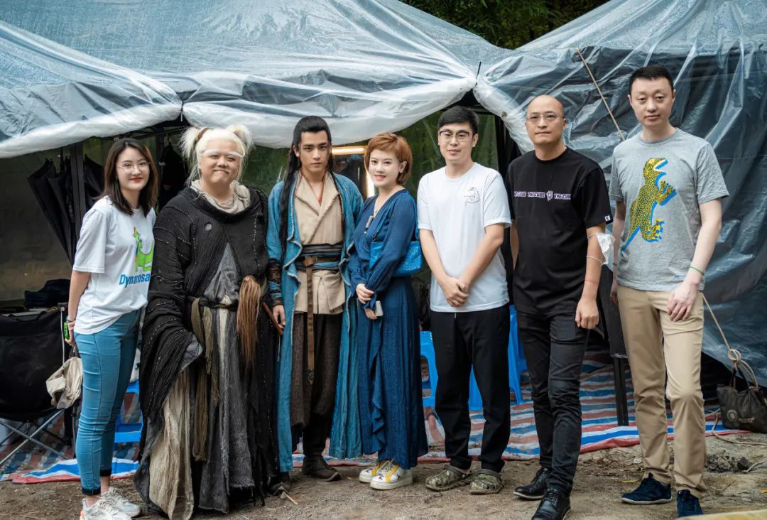 右起:拉近影业总裁胡庆刚、爱奇艺会员及海外业务群总裁杨向华、总导演朱凌锋、米和花影业创始人、总制片人窦黎黎、郭靖饰演者耿業庭、周伯通饰演者林子聪、制片人韩若华在拍摄现场