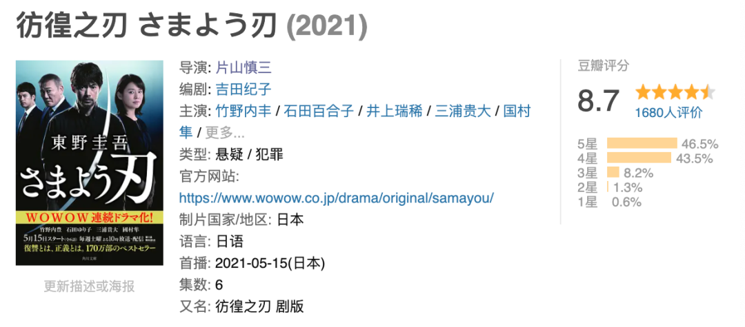 仔细一看,这部剧的来头也不小,目前已经在日本wowow电视台播出了四集,豆瓣也达到了8.7的高分。