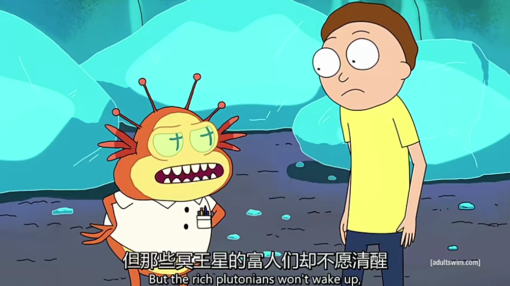 比如第一季第九集,冥王星上的统治阶层为了挖矿,隐瞒行星变成矮行星,最终导致其毁灭,以讽刺舆论控制。